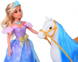 Un cheval blanc à crinière bleue, avec selle et bride, tire le carrosse. Idéal pour jouer aux voyages royaux et aux histoires féeriques.