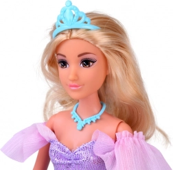 La poupée a de longs cheveux blonds, une tiare turquoise et un collier. La robe dans des tons bleu‑violet avec un nœud doré et des motifs de neige apporte de la magie à chaque bal.