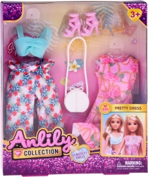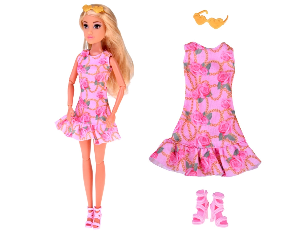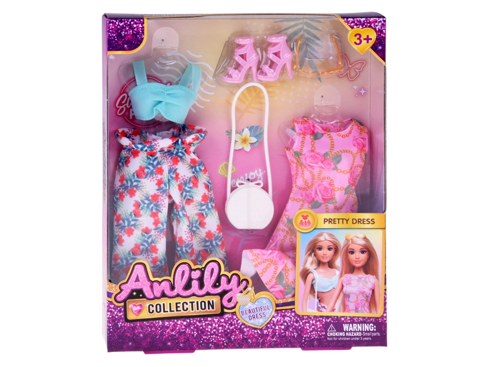 Le contenu du coffret comprend une robe rose romantique à motif floral et chaîne et un top turquoise avec un pantalon large à fleurs. Le style est complété par des chaussures à talons roses, des lunettes jaunes en forme de cœur, un petit sac à main et d’autres accessoires. Idéal pour le mix & match des tenues et pour jouer à la styliste.