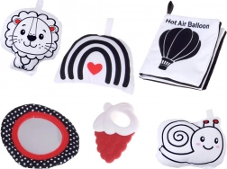 Figurines souples, petit livre contrasté, hochet, miroir et anneau de dentition encouragent la préhension, la coordination œil‑main et la stimulation sensorielle.