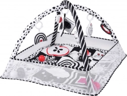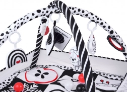 Les motifs contrastés (noir, blanc, rouge) aident bébé à mieux focaliser et stimulent son développement visuel. La surface moelleuse favorise le temps sur le ventre, le relevé de la tête et le renforcement des muscles du cou et du dos – des étapes clés vers le retournement, le rampement et la marche.
