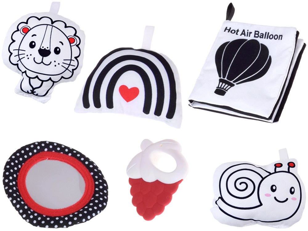 Les motifs noir‑blanc avec des accents rouges favorisent la mise au point, le suivi des mouvements et l’attention naturelle des nouveau‑nés dès les premiers jours.
