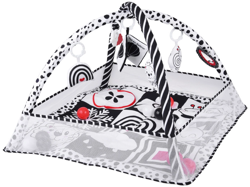 Deux arceaux doucement rembourrés avec divers jouets suspendus motivent à s’étirer, attraper et bouger. Les parois latérales en maille transforment instantanément le tapis en un parc douillet avec balles pour un jeu sécurisé sous la surveillance d’un adulte.