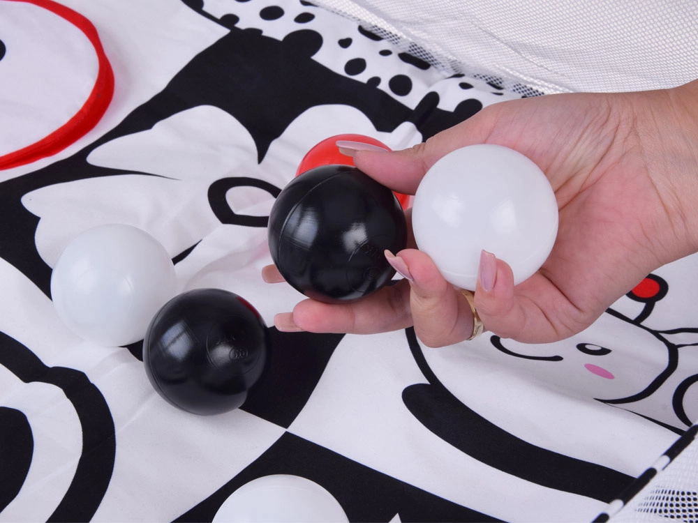 La maille respirante garde les jouets à l’intérieur et offre une bonne visibilité aux parents. Les balles en plastique incluses transforment le tapis en un mini terrain de jeu ludique.