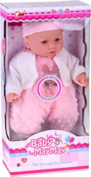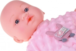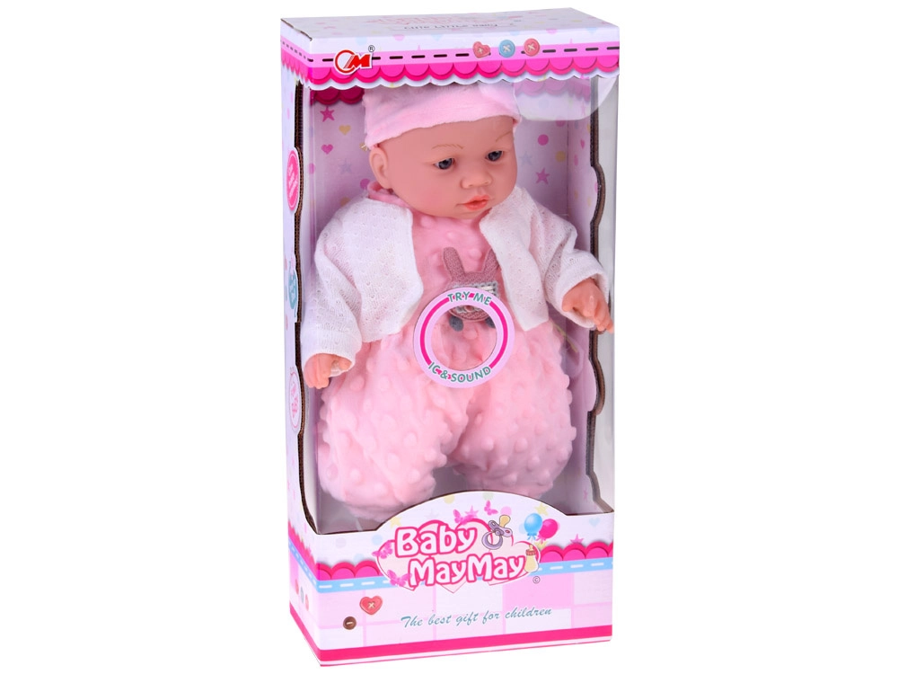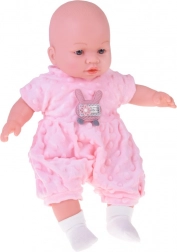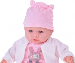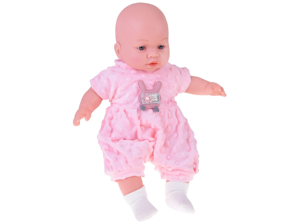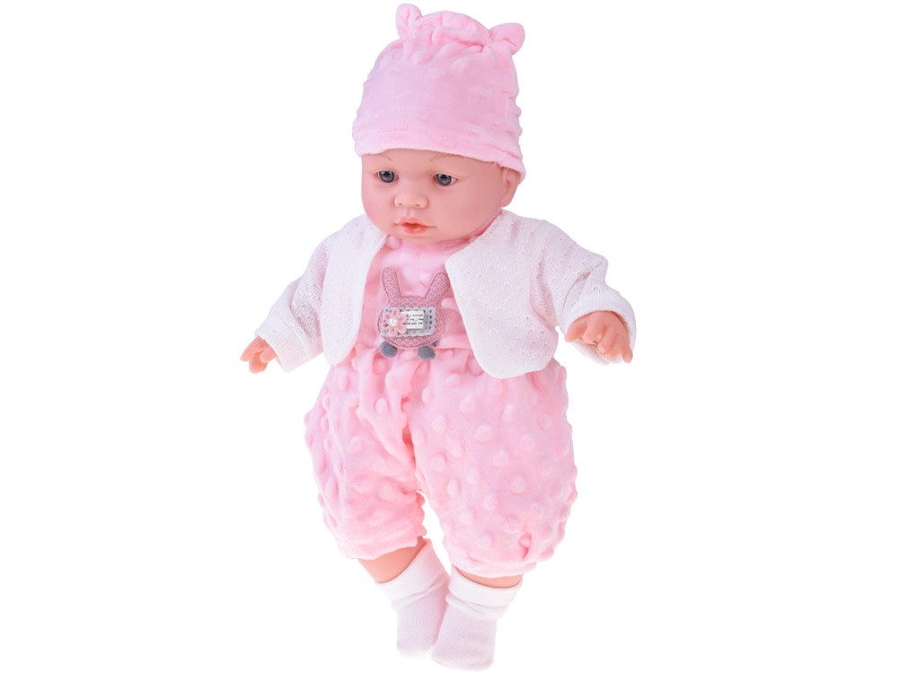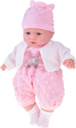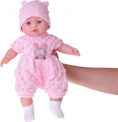Adorable bébé de 40 cm qui ravira chaque enfant dès 12 mois. Grâce à son corps textile souple, elle est parfaite pour les câlins, légère à porter et présente des détails faciaux réalistes. En appuyant sur le ventre, elle émet différents sons – babille, rit, pleurniche et grogne. Inclus : un doux grenouillère en minky rose avec application, une petite bonnet à oreilles, un cardigan blanc et des chaussettes.