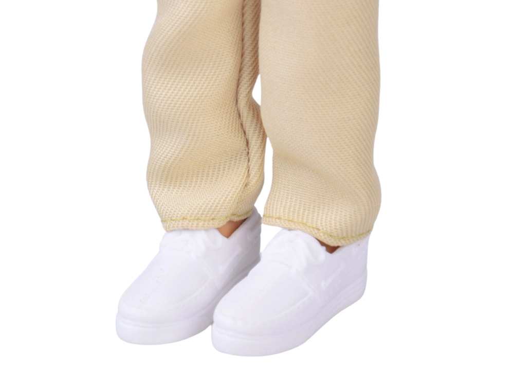 Une chemise élégante à col, un pantalon clair et des chaussures blanches donnent à la poupée un look moderne. Les vêtements peuvent être retirés et combinés.