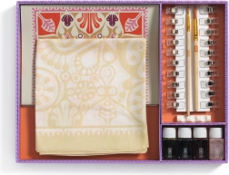 Le coffret contient des peintures textiles, des pinceaux, des pinces, un bol pour la peinture, un pochoir et un foulard en soie. Il suffit d’ouvrir et de commencer à peindre.