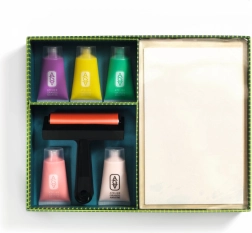 Un kit pratique comprenant une plaque en gel, un rouleau, cinq couleurs et des papiers pour commencer à créer dès l’ouverture.