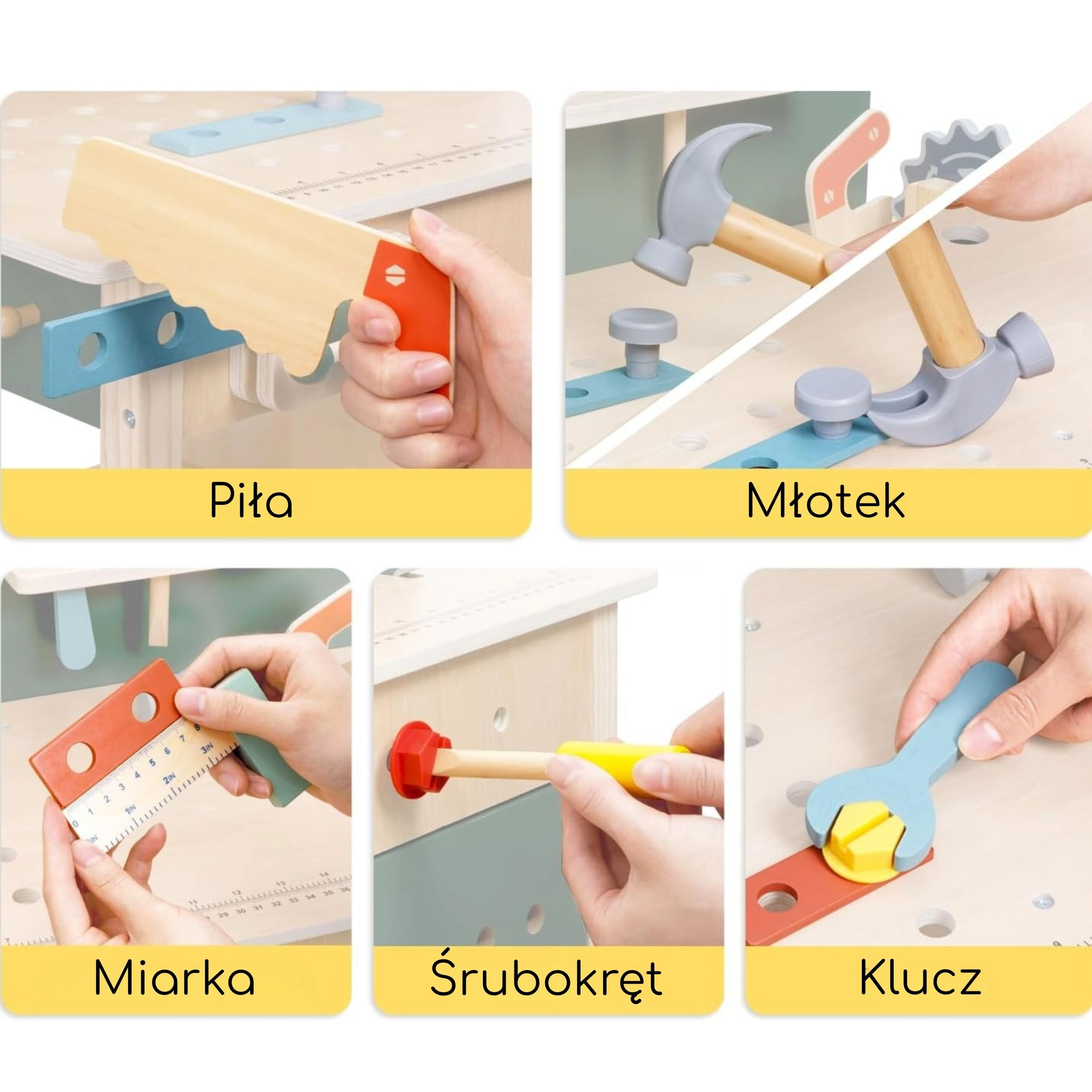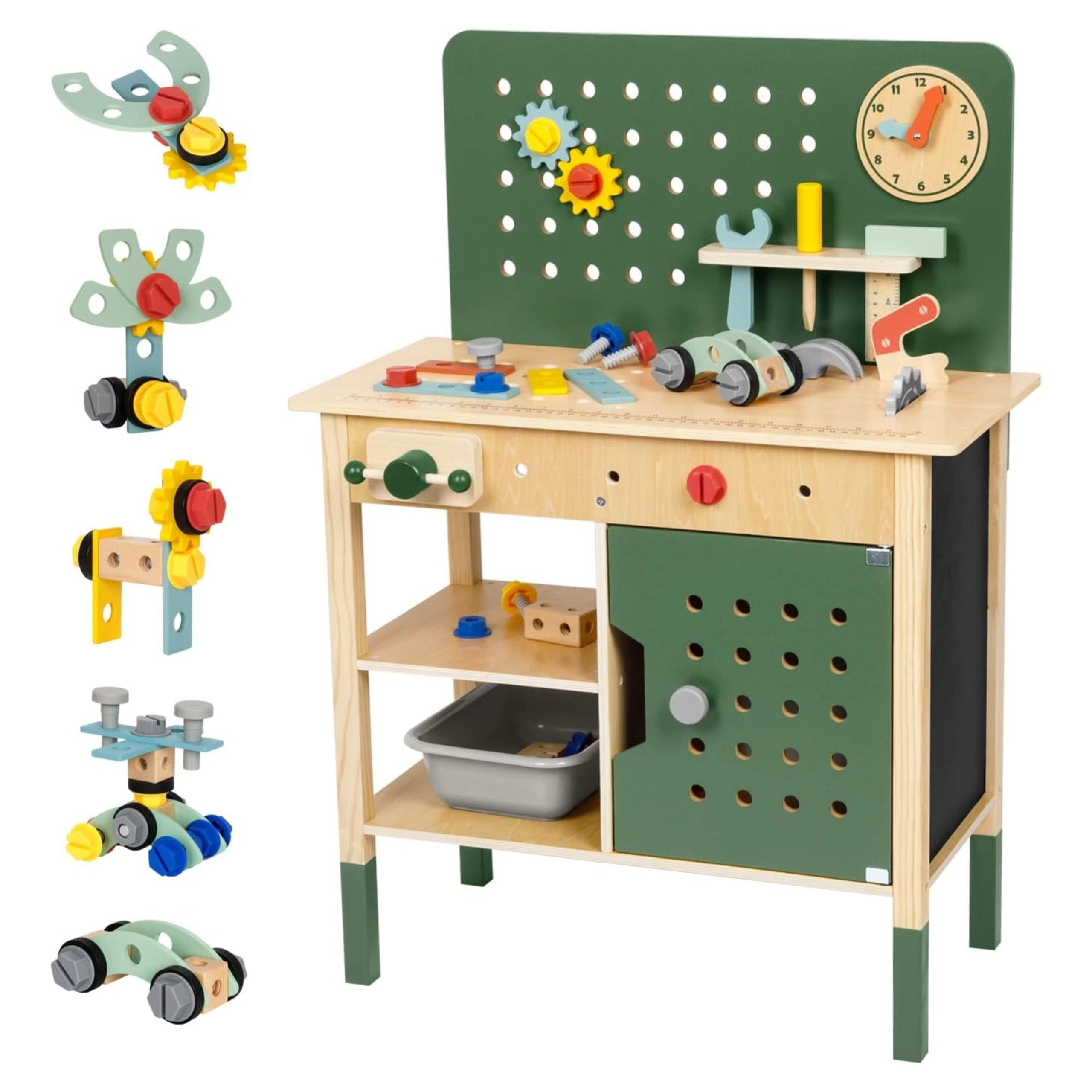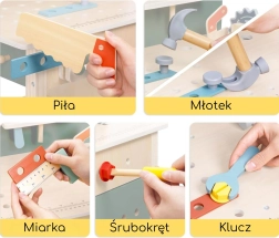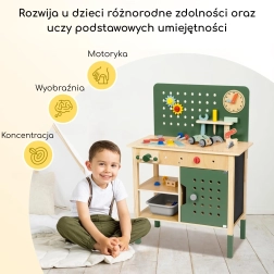 L'atelier comprend des éléments réalistes : un étau pour fixer les pièces, une « scie » sûre pour imiter la découpe, une ardoise à la craie pour croquis et idées, une horloge à aiguilles mobiles pour apprendre l'heure et des porte-outils avec panneau perforé suspendu. Sont inclus un ensemble de vis, écrous, engrenages et connecteurs en bois pour construire des petits véhicules et des structures, qui développent la coordination œil–main, la patience et la créativité.