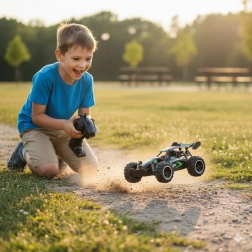 Vivez l’adrénaline avec ce buggy RC compact qui atteint jusqu’à 18 km/h. Grâce au contrôle 2,4 GHz, aux grands pneus à gros crampons et à la suspension à ressorts, il maîtrise le gravier, l’herbe et les terrains irréguliers. Conduite facile, réponse rapide et construction robuste garantissent du plaisir pour les enfants comme pour les adultes.