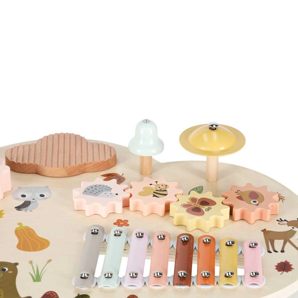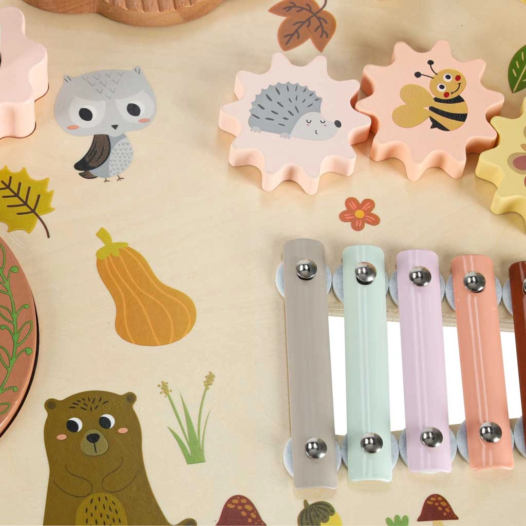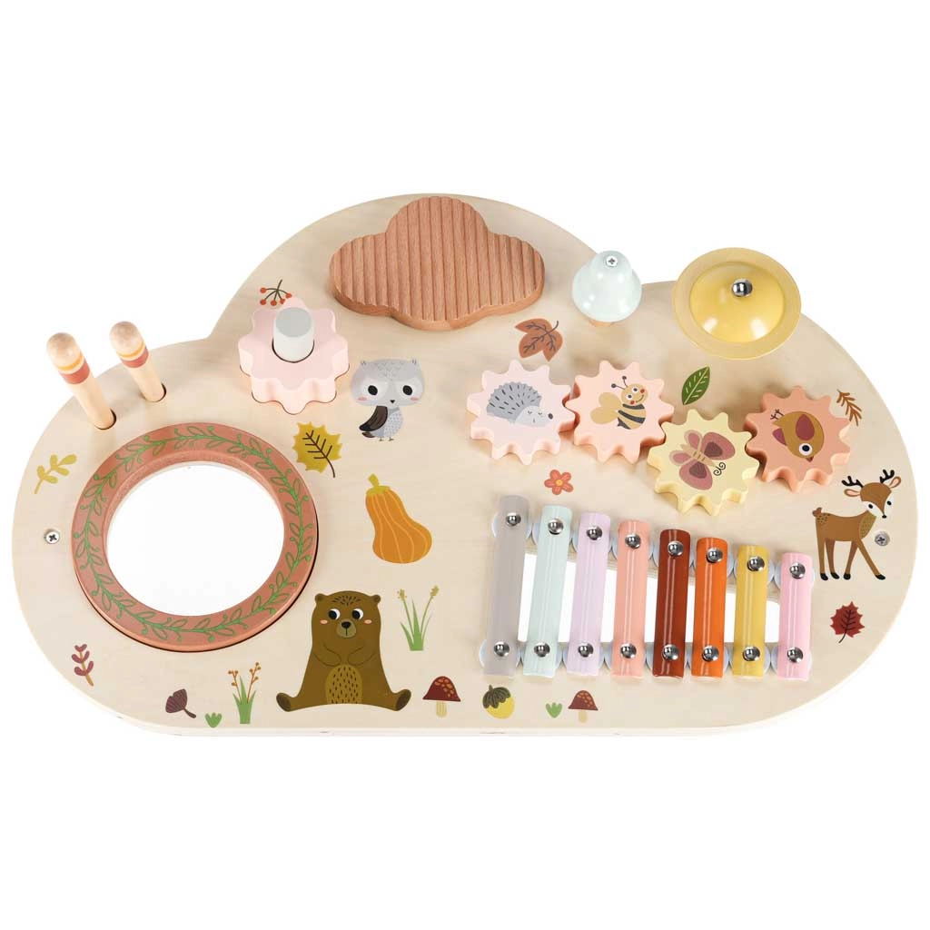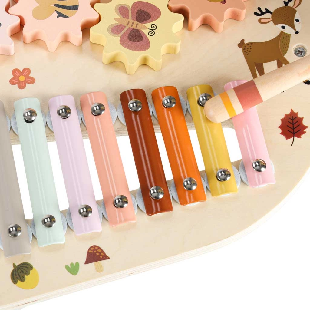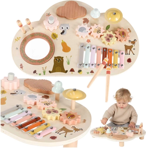 Cette table musicale en bois est un véritable centre d’activités : les enfants peuvent taper avec les mailloches, faire tourner les engrenages, explorer les textures et créer leurs premières mélodies. Chaque élément soutient le développement de l’ouïe, la coordination œil–main ainsi que la motricité fine, et apporte la joie de la découverte.