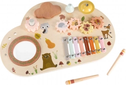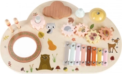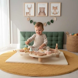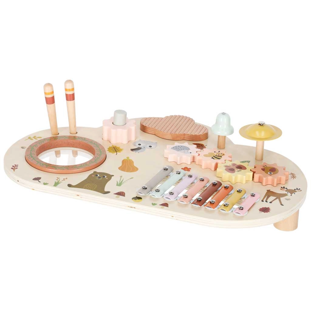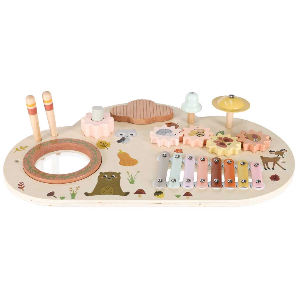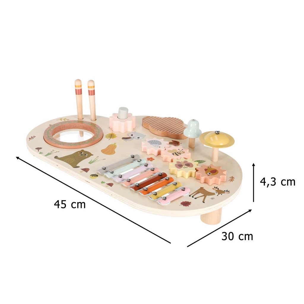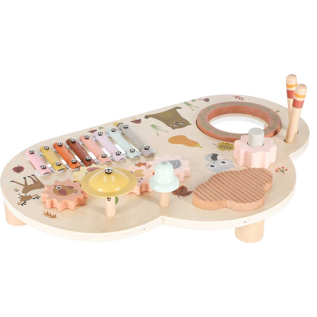 Cette table musicale en bois est un véritable centre d’activités : les enfants peuvent taper avec les mailloches, faire tourner les engrenages, explorer les textures et créer leurs premières mélodies. Chaque élément soutient le développement de l’ouïe, la coordination œil–main ainsi que la motricité fine, et apporte la joie de la découverte.