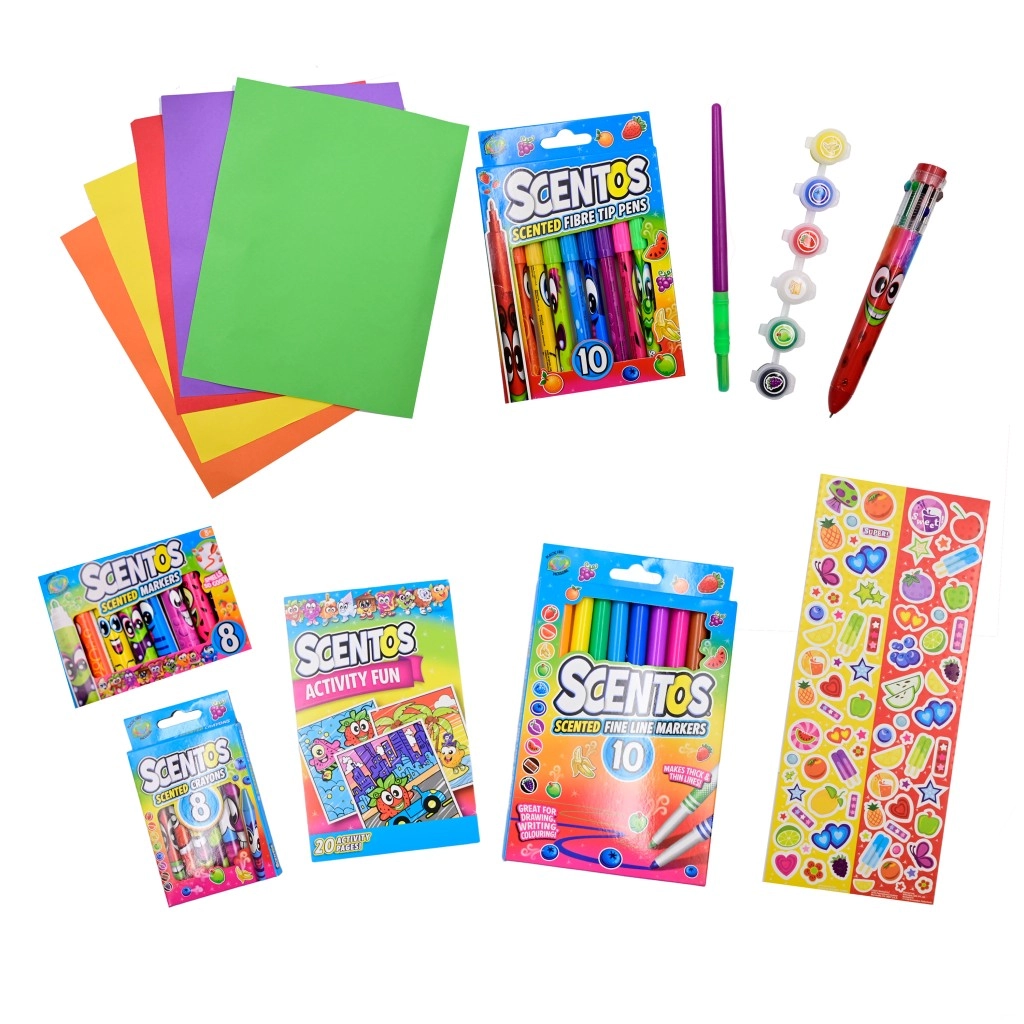 - 10 feutres parfumés à pointe fine, 10 feutres à pointe fibre, 8 crayons de couleur parfumés, 8 crayons de cire, une palette de 6 couleurs de gouache, un petit pinceau, des stickers thématiques, des feuilles de papier colorées (5 couleurs)