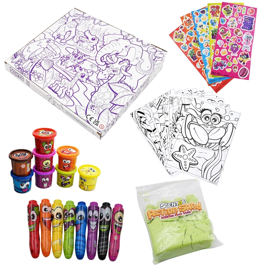 Le set créatif parfumé de voyage Scentos Ultimate offre aux enfants tout le nécessaire pour créer, où que vous soyez. Son emballage léger et pratique contient des outils qui développent la créativité et les compétences motrices, tout en dégageant un agréable parfum – rendant l’activité encore plus amusante.