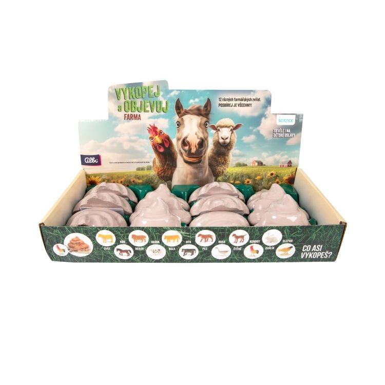 - 12 surprises cachées – chaque bloc de plâtre renferme un animal de la ferme différent.