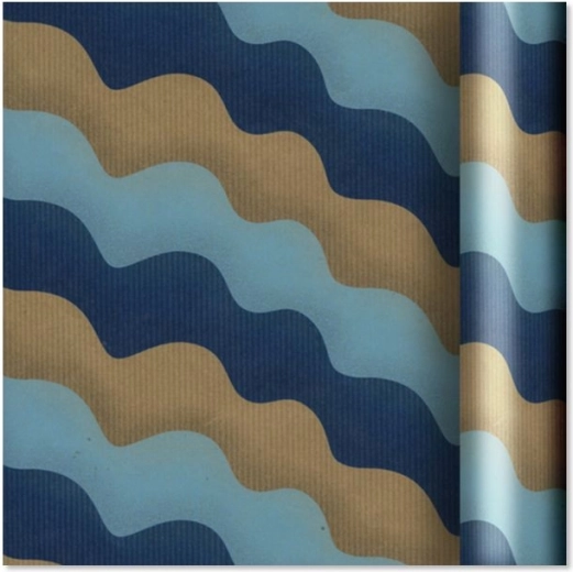 Papier cadeau kraft brun élégant avec un motif ondulé bleu, idéal pour un emballage de cadeaux élégant pour toute occasion. Papier éco-responsable et résistant de 70 cm de large et 2 m de long, couvrant facilement même des paquets plus grands.