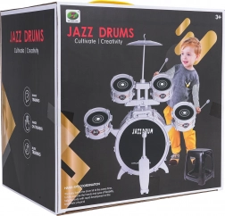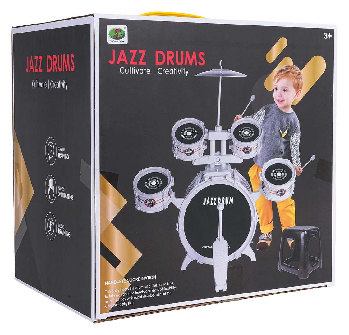Comprend une grosse caisse avec pédale, quatre petits tambours, une cymbale en métal, deux baguettes et un tabouret stable – il suffit d’assembler et de jouer.