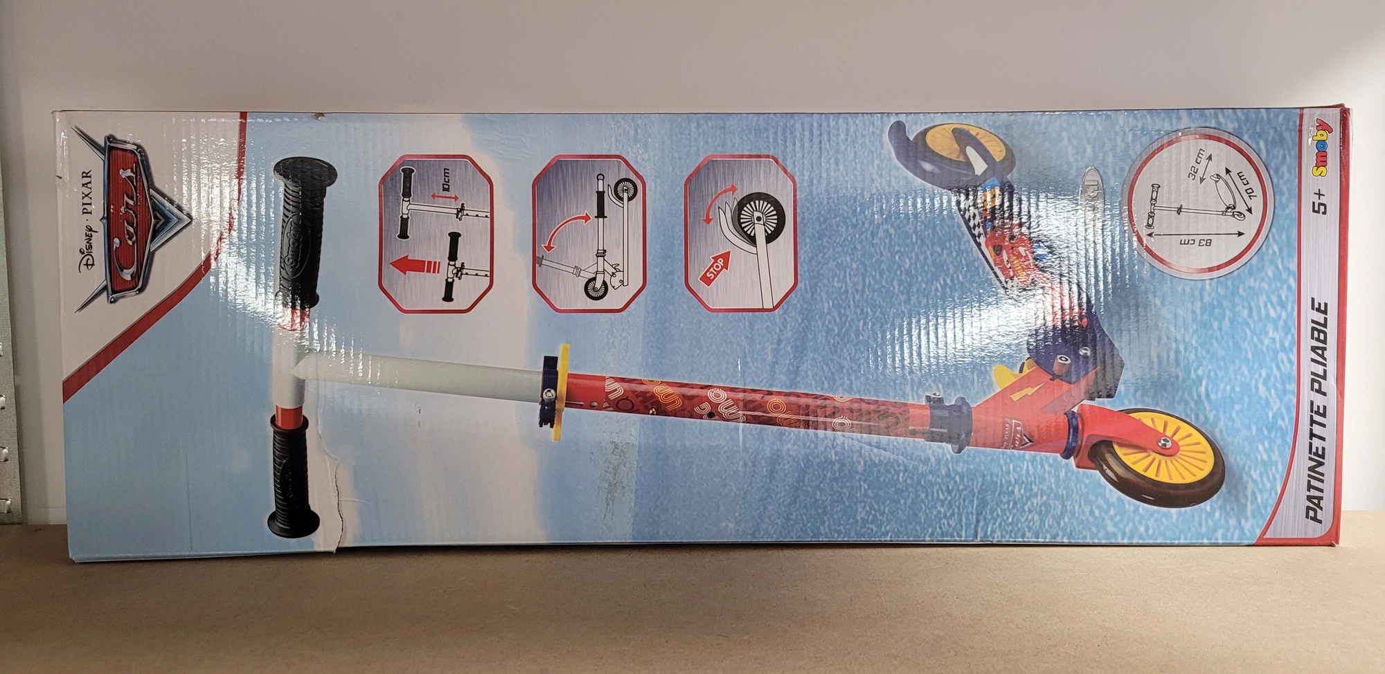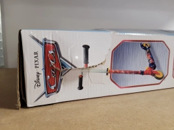 Trottinette pour enfant légère et résistante avec motif Cars CARS – Flash McQueen, qui ravira chaque petit rider. Elle possède une structure en aluminium, un guidon réglable (73–83 cm), un large marchepied antidérapant, des roues silencieuses et un frein au pied. Charge maximale 50 kg, idéale à partir de 5 ans. Avertissement : emballage endommagé, petites rayures/éclats.