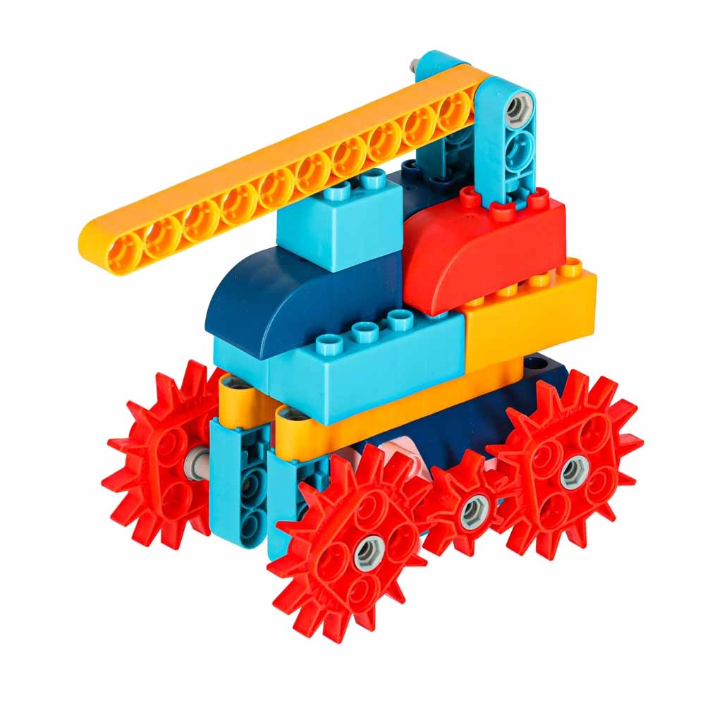 Des engrenages de tailles variées, des axes et des connecteurs permettent des transmissions et des rotations. Les enfants découvrent concrètement les principes de la mécanique et de la transmission du mouvement.