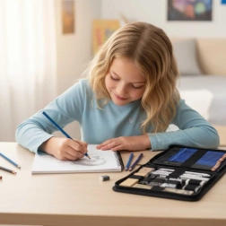 Entrez dans l’univers de la création avec un set de croquis de 54 pièces combinant crayons graphite et fusains, outils de estompe, gommes et étui pratique. Grâce à une large gamme de duretés et à un équipement riche, vous réalisez aisément des ombres délicates comme des détails précis. Inclus également, un carnet de croquis A5 (20 feuilles) pour dessiner à tout moment et partout.