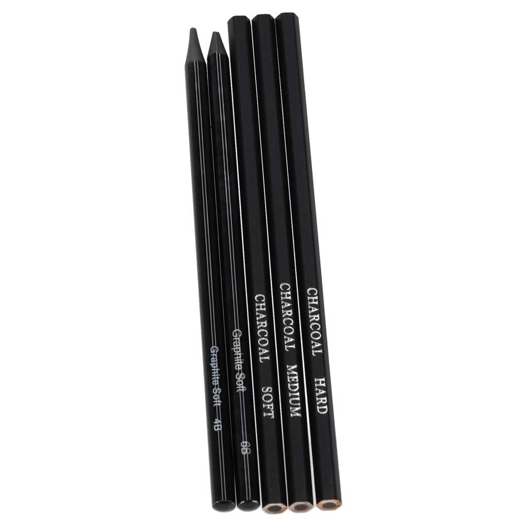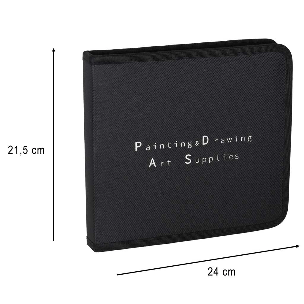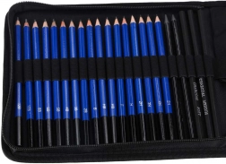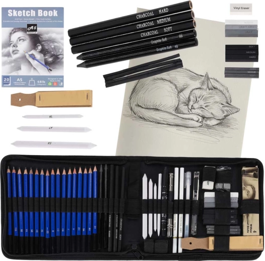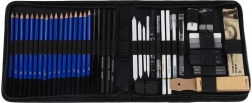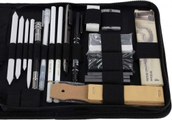 Ce set de croquis complet est idéal pour débutants comme avancés. Il comprend des crayons graphite de 12B à 5H, du fusain en crayon noir et blanc, des bâtons pour les aplats et des estompes en papier pour des transitions de tons fluides. Le tout est rangé de façon claire dans un étui en nylon résistant qui maintient le matériel bien en place.