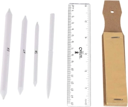 Estompes en papier de différentes tailles, plaque abrasive et règle pour des dégradés propres, des détails et des lignes précises.