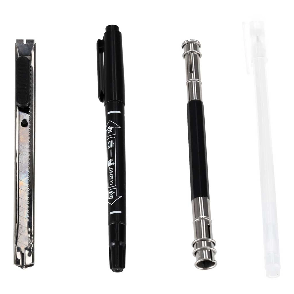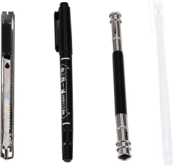 - stylo gel blanc, marqueur noir, rallonge-crayon, couteau à papier, plaque abrasive, règle