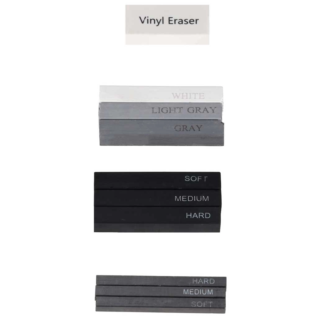 Pour accentuer les lumières, utilisez le stylo gel blanc et les crayons fusain blancs ; pour les corrections, une gomme vinyle et une gomme mie de pain. Sont inclus taille-crayons, rallonge-crayon, règle et plaque abrasive pour une pointe parfaite.
