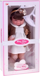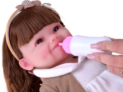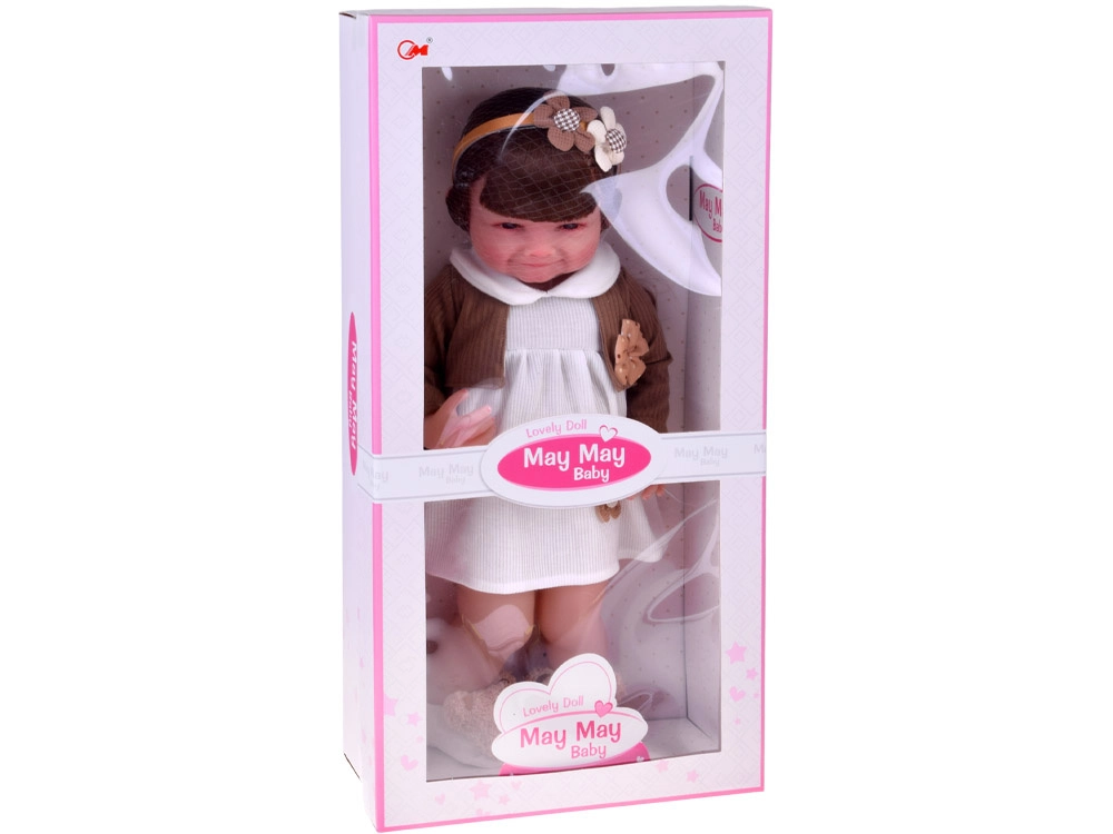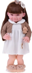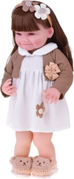 Cette belle poupée porte une petite robe blanche avec appliqué fleuri et un gilet brun avec petit nœud. La tenue est complétée par de douilles pantoufles en forme d’oursons et un serre-tête beige orné, qui soulignent son look tendre et enfantin. Grâce à son visage réaliste et à ses longs cheveux, les enfants profiteront d’heures de jeu créatif.