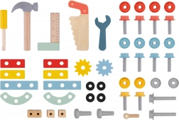 Grâce aux bandes en caoutchouc sur les roues, la conduite est silencieuse et respecte le sol. La poignée ergonomique tient bien dans la main des enfants et la boîte arrière pour outils accueille toutes les pièces. L’ensemble comprend un riche assortiment d’outils en bois et de pièces d’assemblage pour des constructions sans fin.