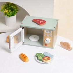 Le set comprend une petite assiette de service et une sélection d’aliments en bois – steak, poulet, poisson, pâtisserie, donut et légumes – afin que les enfants puissent « réchauffer », servir et inventer leurs propres recettes. La fabrication de qualité en bois durable et les bords soigneusement poncés assurent un jeu en toute sécurité au quotidien.