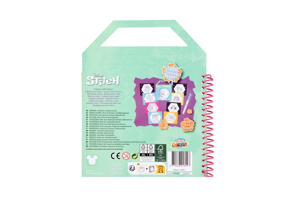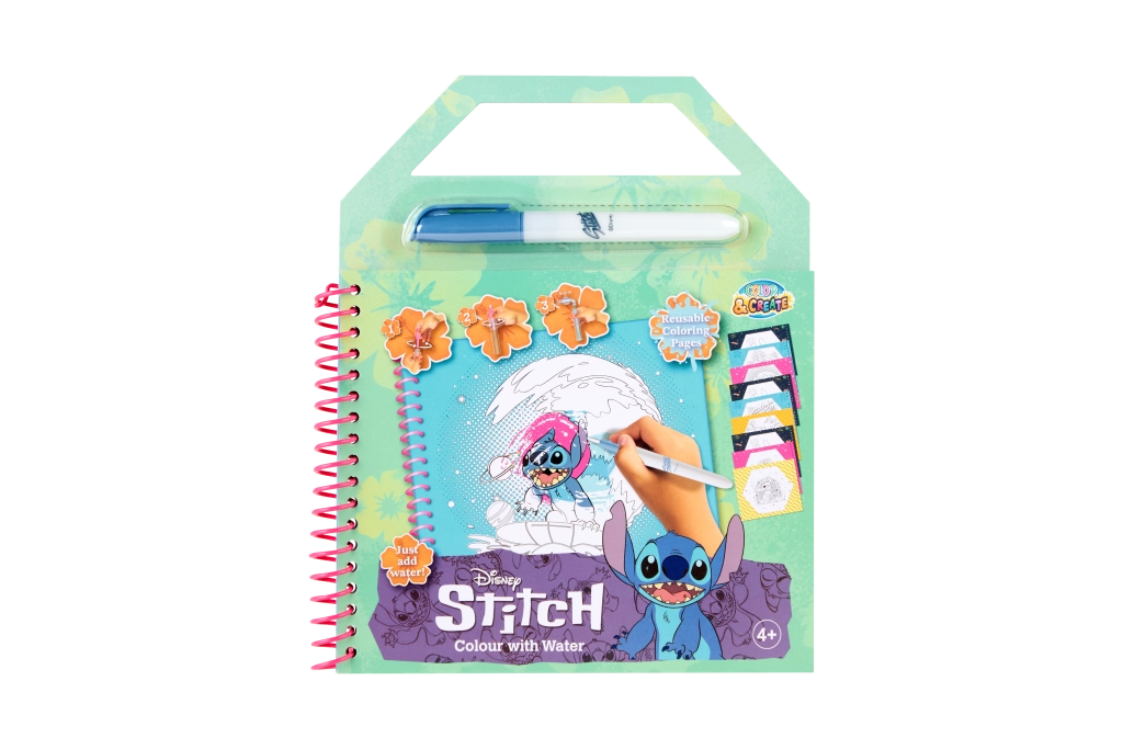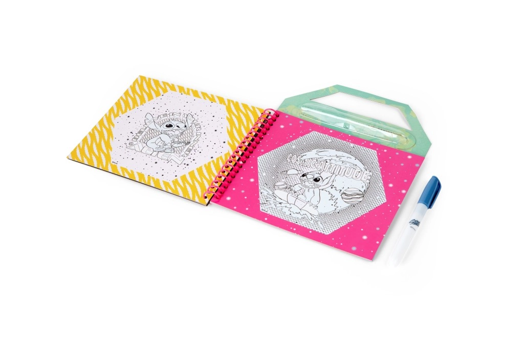 Il suffit de remplir le stylo d’eau et de passer sur la page – les teintes cachées apparaissent instantanément. Une fois sec, le cahier peut être réutilisé.