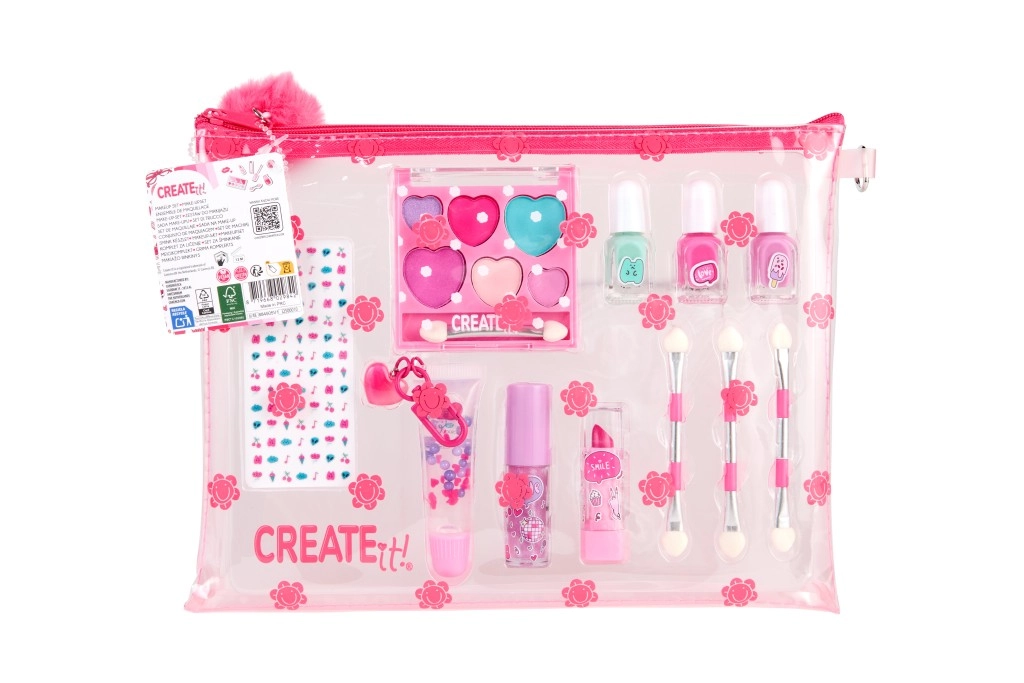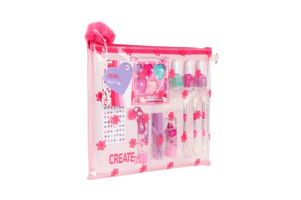 Adorable set de maquillage pour enfants dans une trousse transparente, idéal pour les petites coquettes. Il contient tout le nécessaire pour un maquillage ludique et la décoration des ongles : 3 vernis à ongles, un gloss, un baume à lèvres, 3 applicateurs et des autocollants pour ongles. La trousse pratique avec pom‑pom est à la fois décorative et garde tous les accessoires cosmétiques bien rangés.