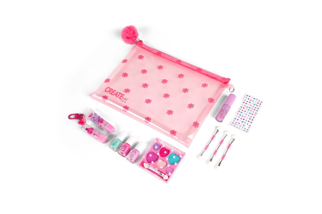 Ce set de maquillage ludique pour enfants, dans une trousse rose transparente à motif floral, offre une manière sûre et amusante de découvrir l’univers du maquillage. Grâce au rangement clair, chaque article a sa place et les enfants peuvent emporter facilement leurs produits de beauté partout.