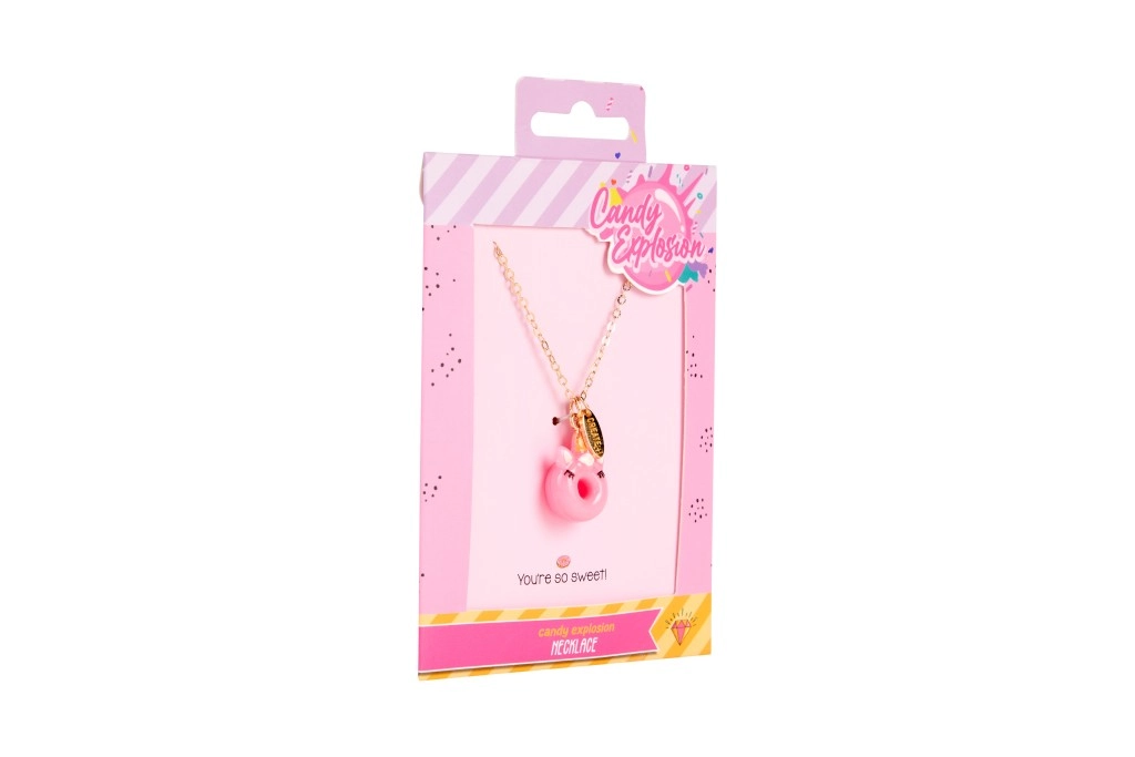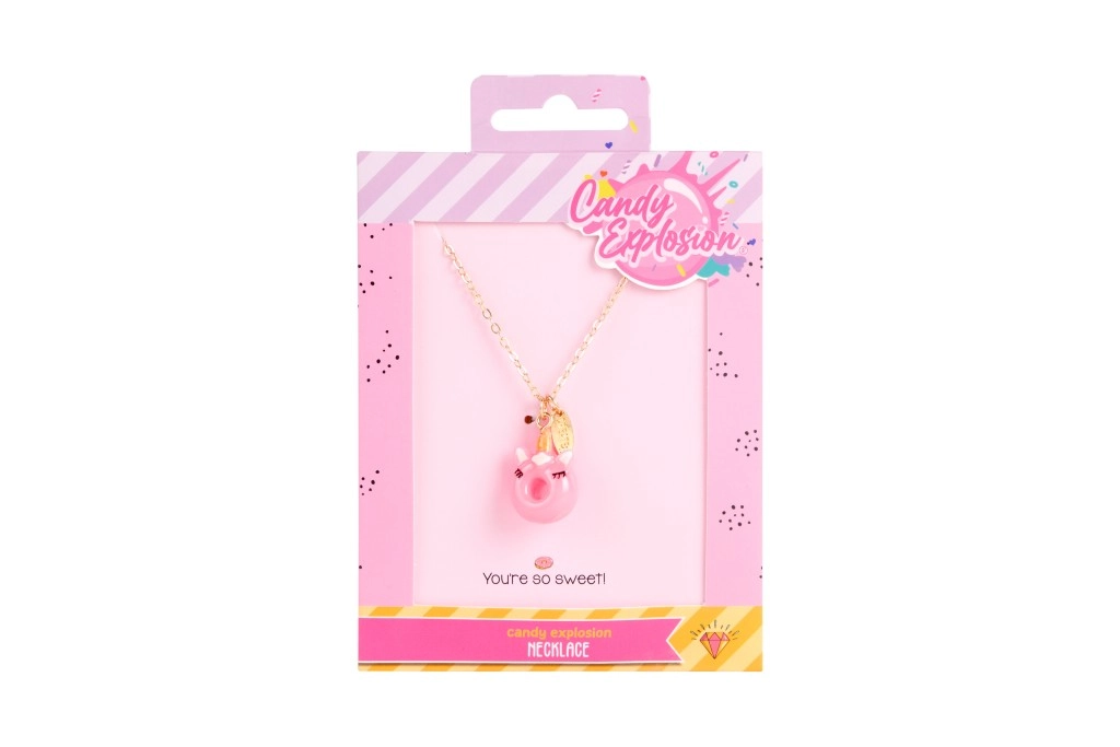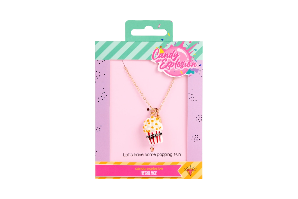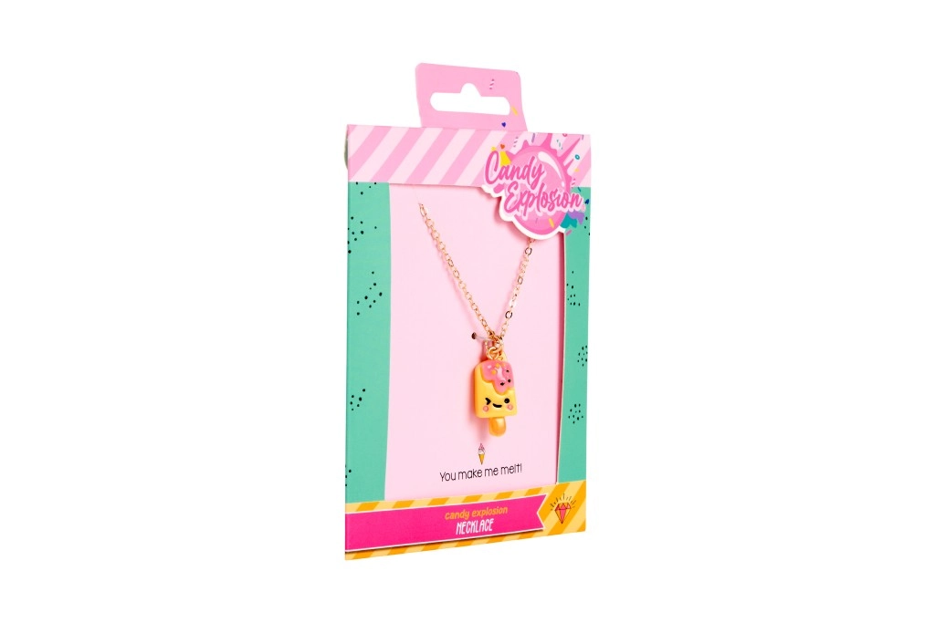 Adorable collier pour enfant avec une collection de pendentifs gourmands de la série Candy Explosion, qui ravira chaque petite coquette. Léger chaîne dorée avec pendentif émaillé ludique (donut, esquimau, boisson, cupcake ou popcorn) et longueur ajustable, idéal au quotidien, livré dans un emballage cadeau prêt à offrir.