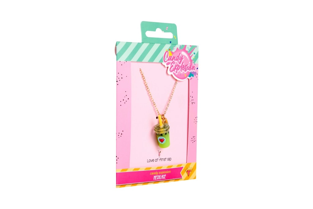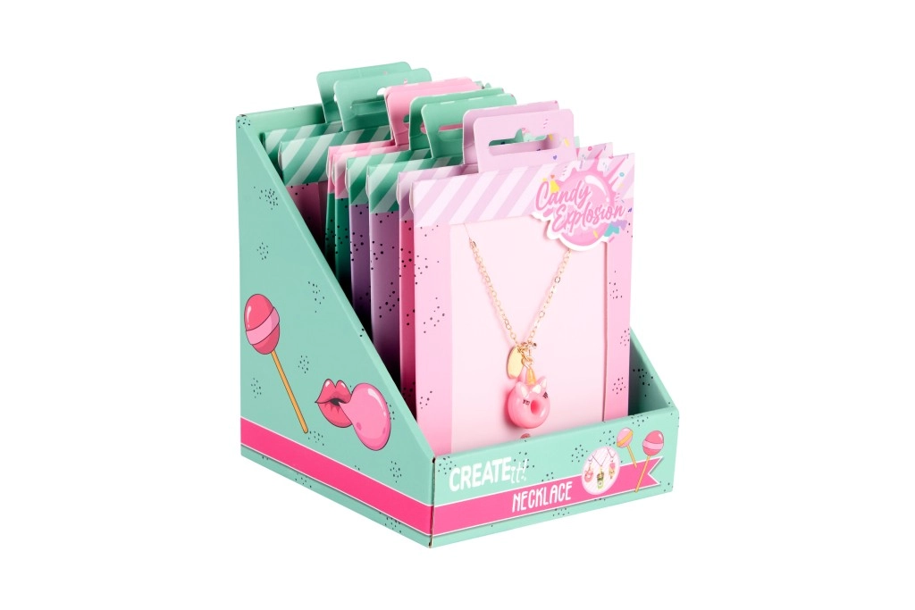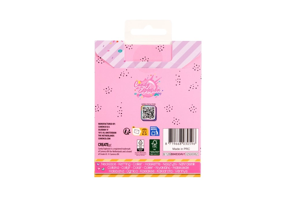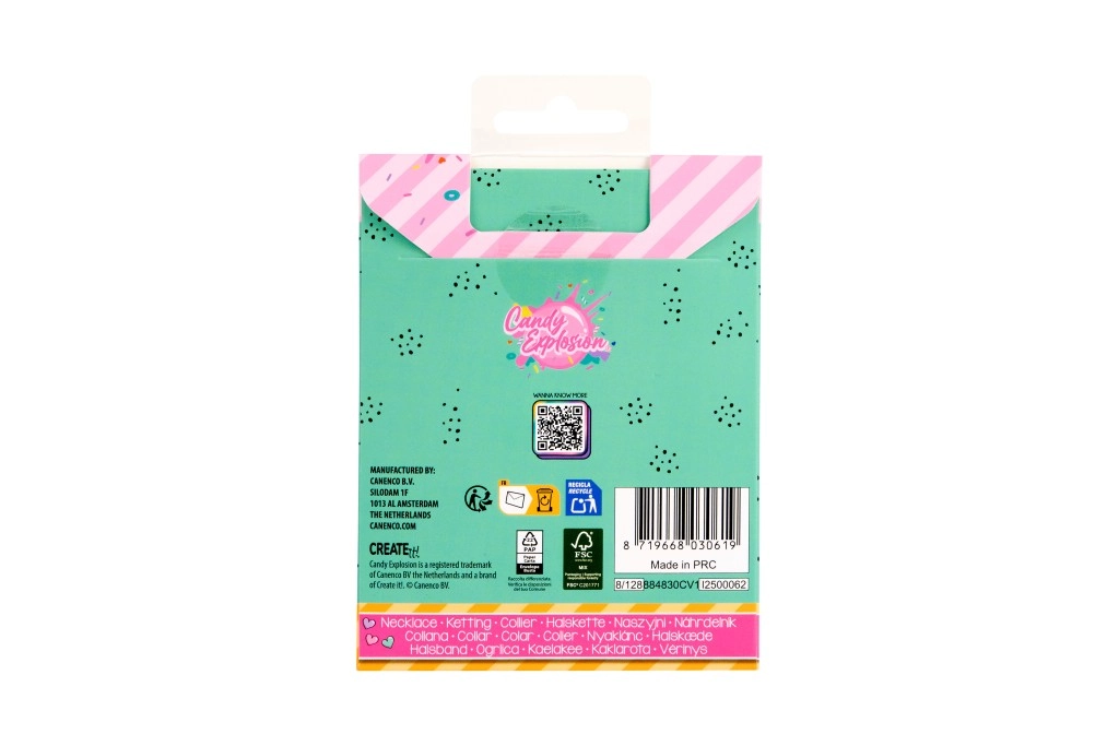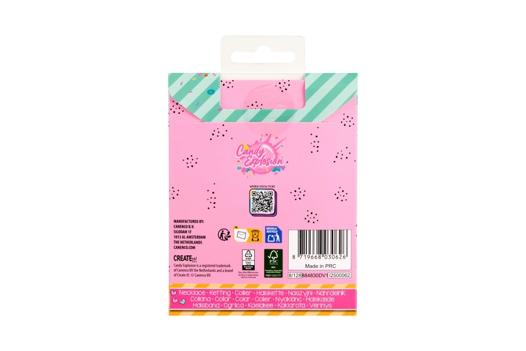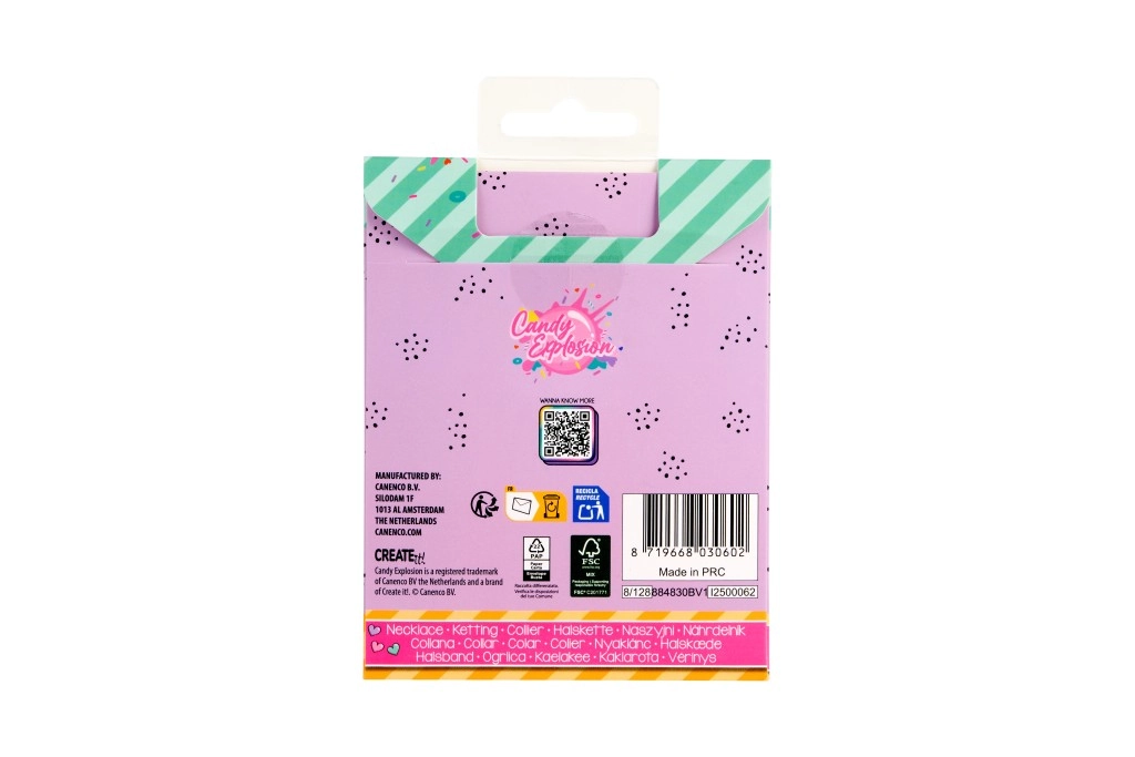 Chaque collier est présenté sur une carte stylée Candy Explosion avec trou de suspension – idéal comme petit cadeau.
