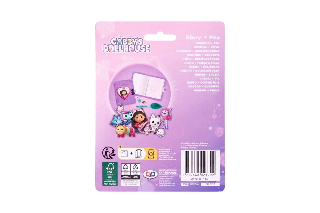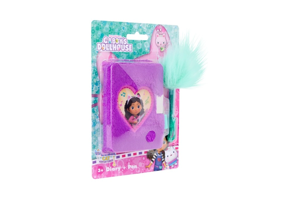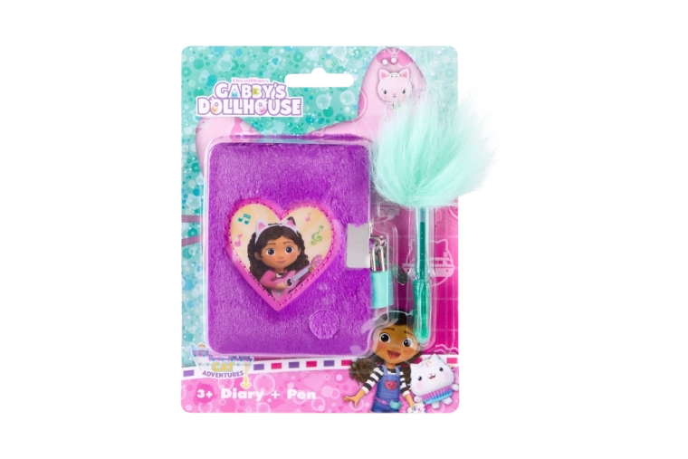 Découvrez le monde magique des notes avec le journal en peluche GABBY’S DOLLHOUSE. Sa douce couverture violette invite au toucher, tandis qu’un petit cadenas en métal avec deux clés garde tous les secrets en sécurité. Inclus, un stylo stylé avec topper duveteux pour rendre l’écriture, le dessin et la création encore plus amusants.