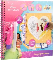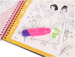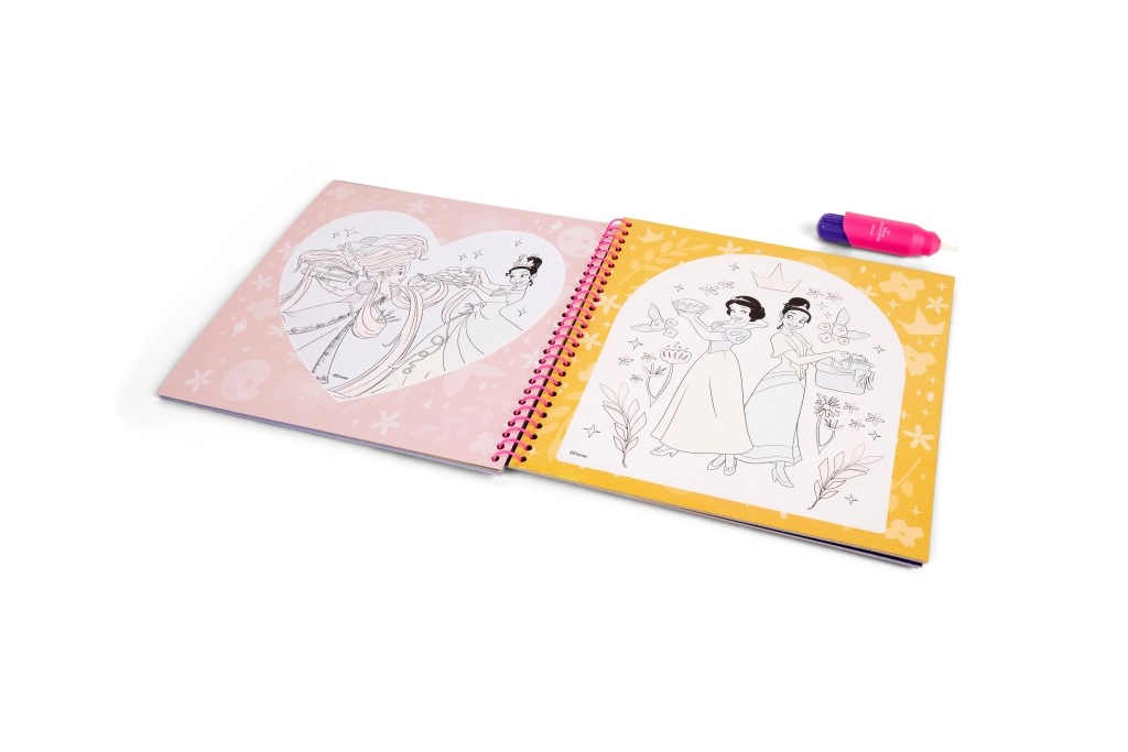 Découvrez un livre de coloriage magique avec des motifs des Princesses DISNEY, qui fonctionne sur le principe de la peinture à l’eau. Il suffit de remplir le pinceau fourni avec de l’eau, de passer sur l’illustration et les couleurs apparaissent toutes seules. Une fois sec, le dessin s’estompe, le livre est donc réutilisable – idéal en voyage comme pour les activités à la maison.