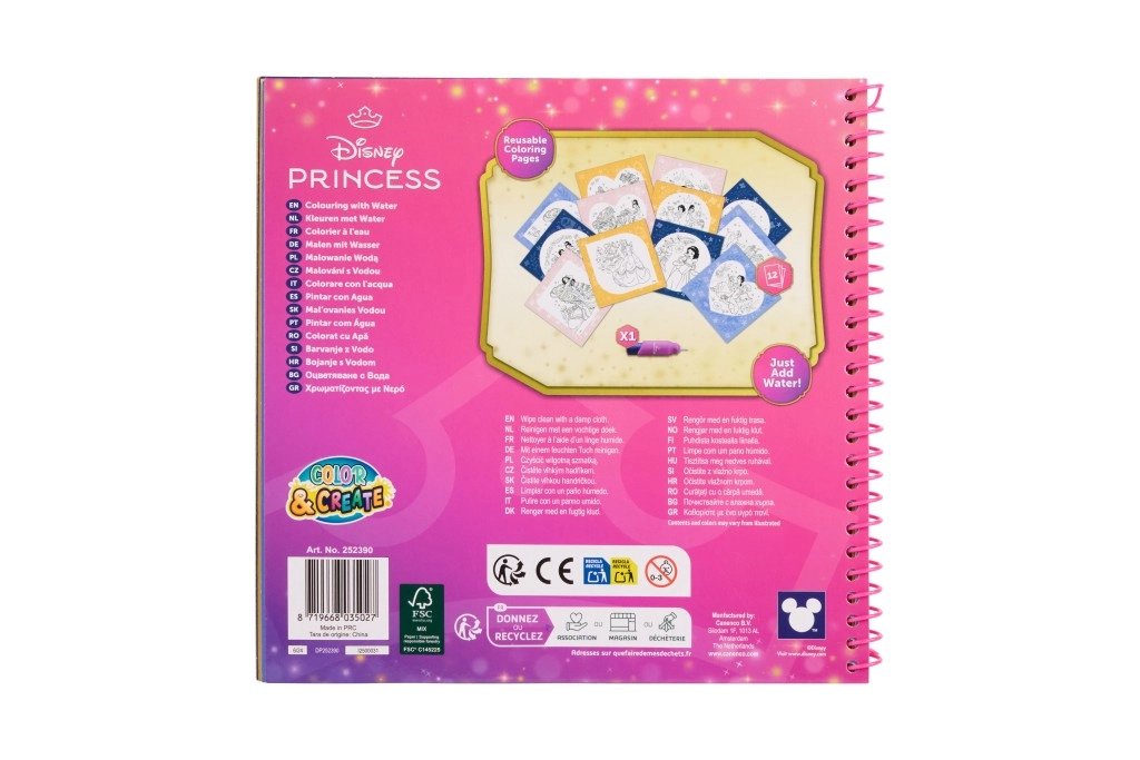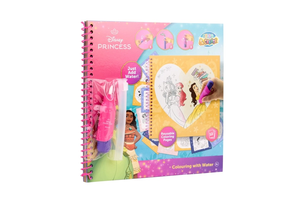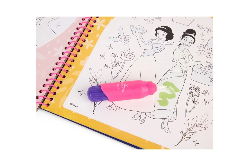 Ce livre créatif offre aux enfants une activité de peinture sûre et propre, sans salissures. Grâce au pinceau à eau, de magnifiques illustrations des Princesses DISNEY se révèlent en passant simplement sur l’image. Lorsque la page sèche, les couleurs disparaissent et les enfants peuvent peindre encore et encore.