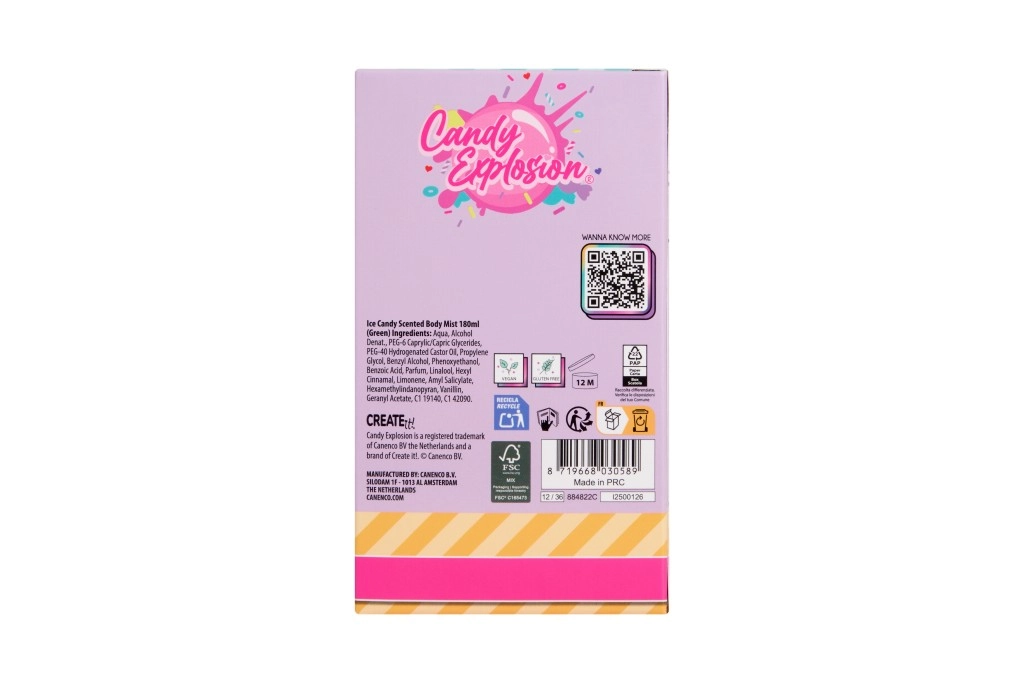 Découvrez un parfum ludique avec la brume corporelle Candy Explosion en trois variantes sucrées – Strawberry Vanilla, Pink Sugar et Ice Candy. Cette brume légère rafraîchit la peau, laisse un parfum doux et longue durée et est idéale pour une utilisation quotidienne après la douche ou au cours de la journée. Convient à tous les types de peau.