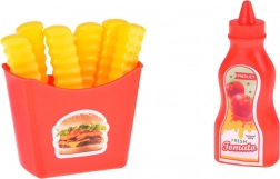 Des accessoires variés sont inclus : plateau de frites, ketchup, pilon de poulet, croissant, pince, assiette et grille pour le panier. Les enfants peuvent « cuisiner » en toute sécurité, servir et s’entraîner aux rôles sociaux à la maison.
