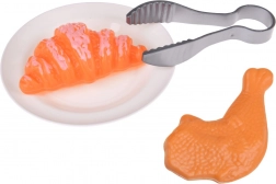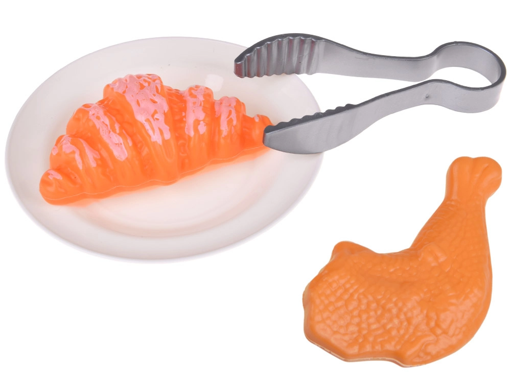 Assiette, pince, grille pour panier, croissant, pilon de poulet, portion de frites avec gobelet et bouteille de ketchup encouragent un jeu créatif de petit chef.