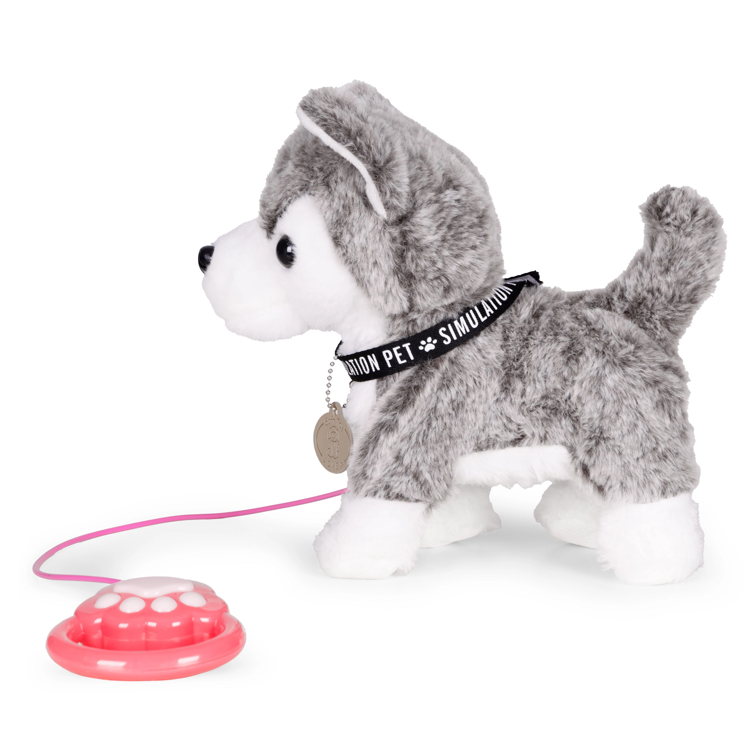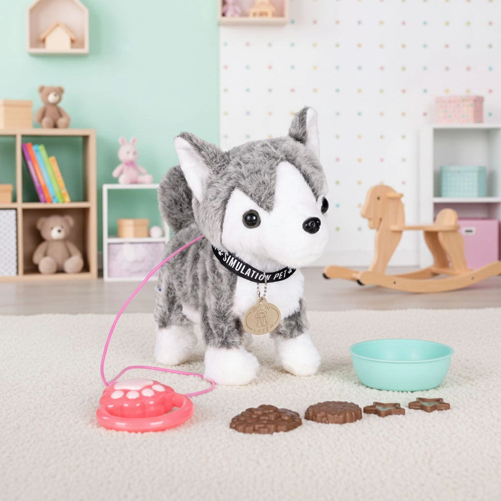 - Chiot husky en peluche, commande sur la laisse, gamelle, friandises en plastique