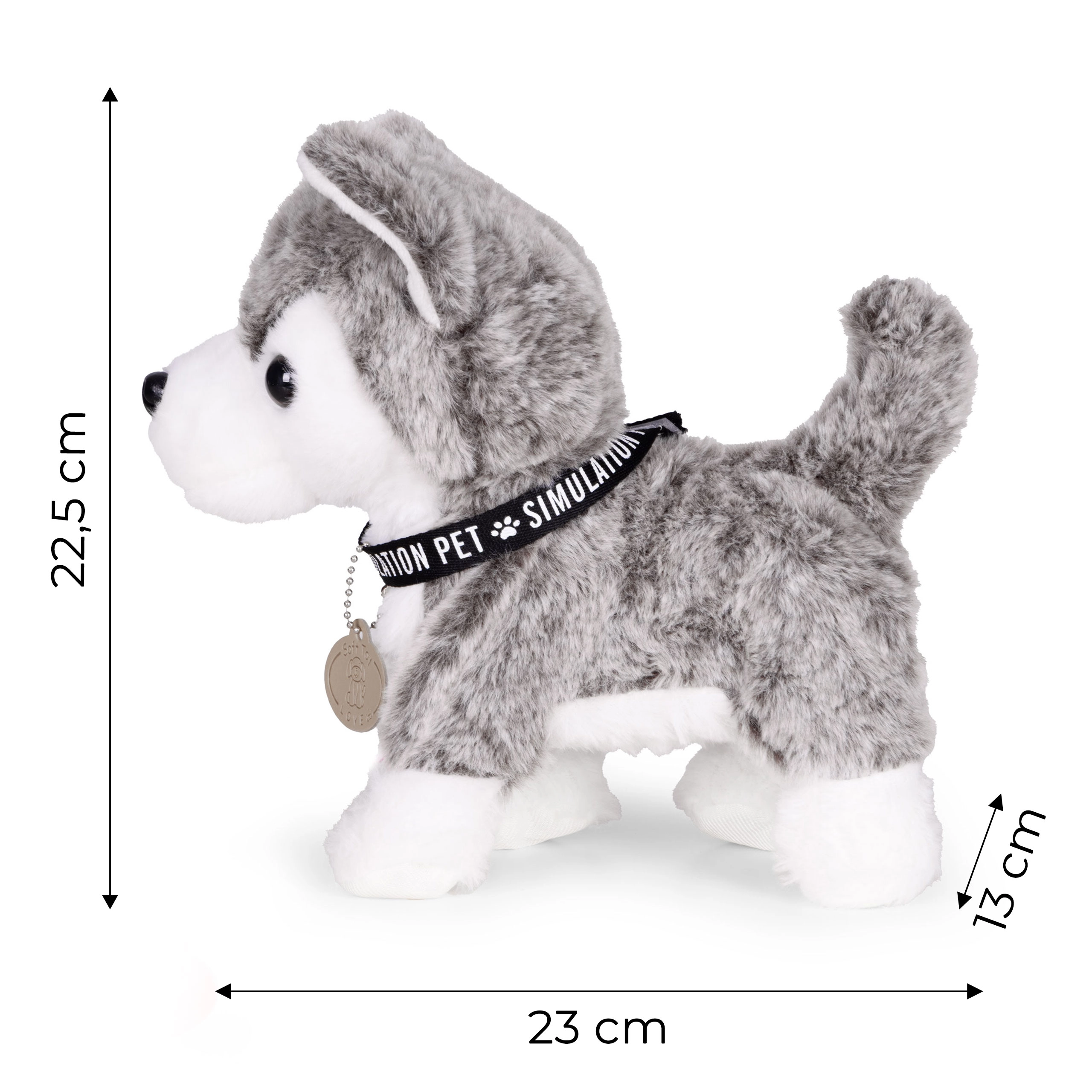 Adorable chiot husky interactif en peluche avec laisse, pour des enfants dès 3 ans, plein de fun. En appuyant sur le bouton, il marche, remue la queue, bouge la tête et joue plus de 20 mélodies. Inclus: gamelle et friandises pour jouer à le nourrir. Son pelage tout doux invite aux câlins et le jeu encourage l’empathie et le sens des responsabilités.