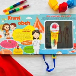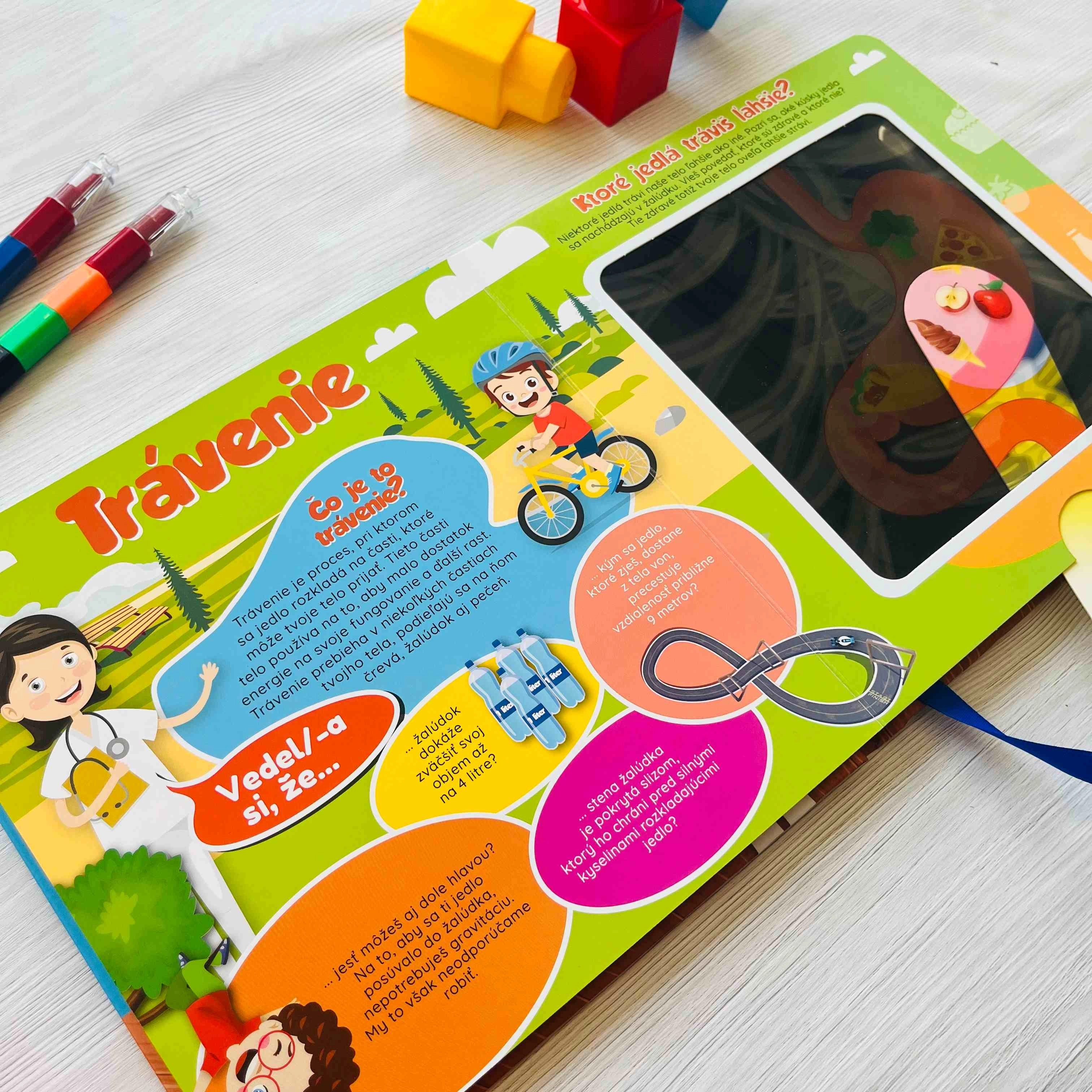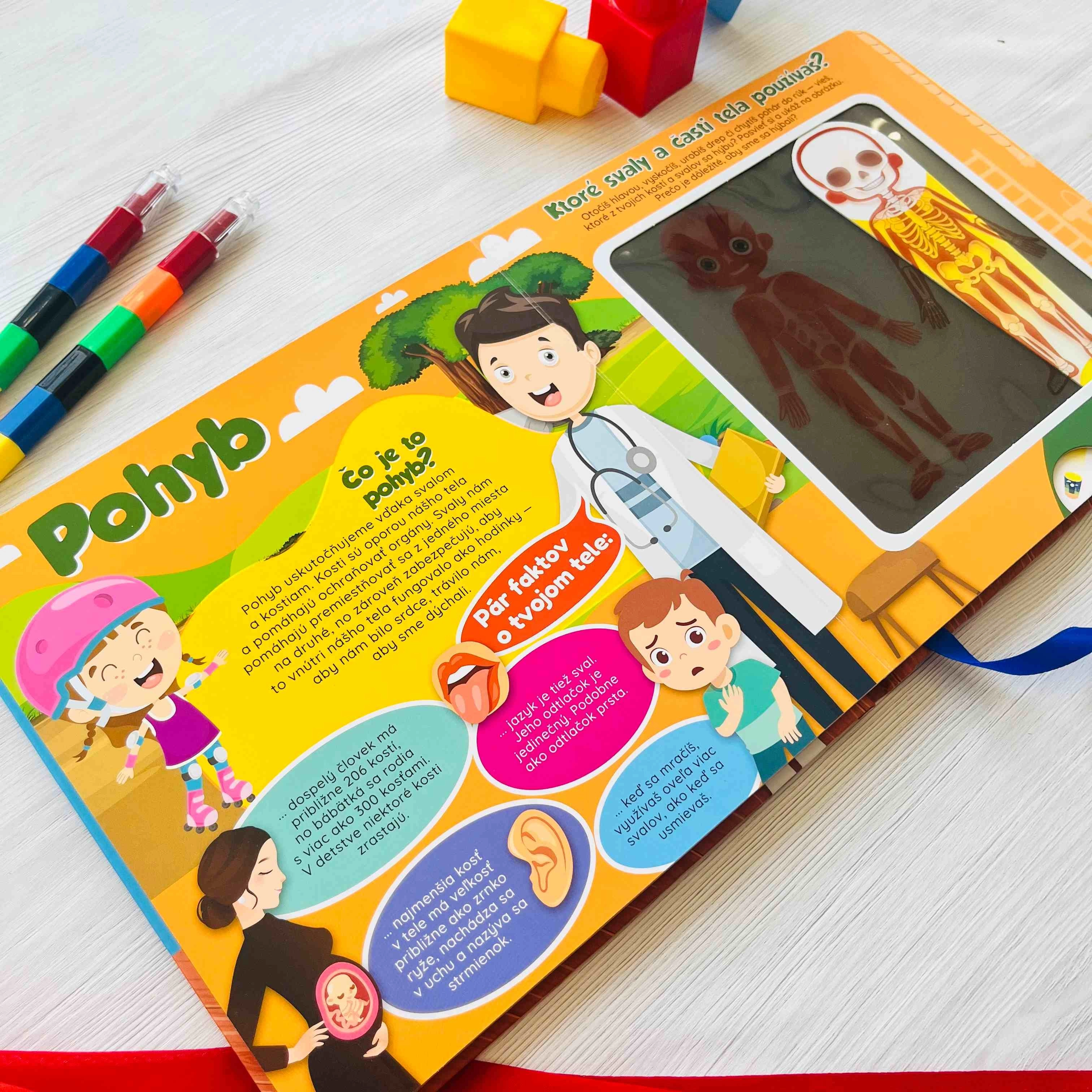 Découvrez les secrets du corps humain avec un livre interactif qui guide les enfants de manière ludique à travers des thèmes comme la respiration, la digestion, le mouvement, la circulation sanguine, les sens et le système nerveux. Grâce aux pages sombres spéciales et à la lampe de poche en papier fournie, les petits explorateurs peuvent révéler des images cachées et les mystères de notre corps. Le livre comprend en outre des activités créatives qui développent l’attention, la pensée logique et l’imagination.
