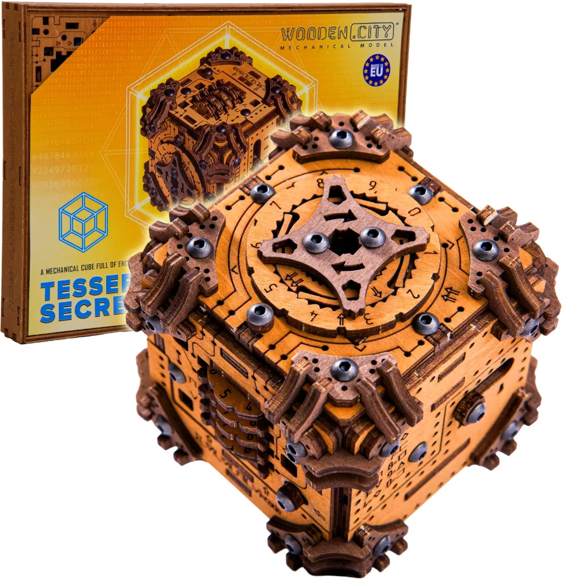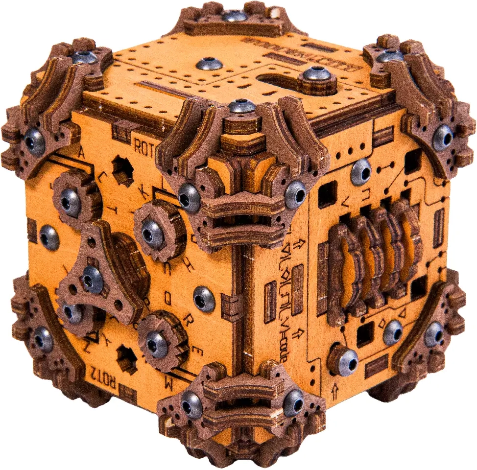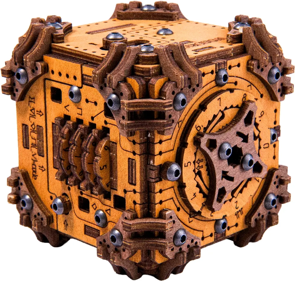 Le puzzle 3D en bois Tesserakt est à la fois un défi esthétique et logique. Assemblez le cube mécanique à partir de 195 pièces découpées avec précision et partez à la découverte de ses mécanismes secrets. Aucune force – seulement de la finesse et des étapes réfléchies – ne vous mèneront à l’ouverture de la cachette dissimulée.