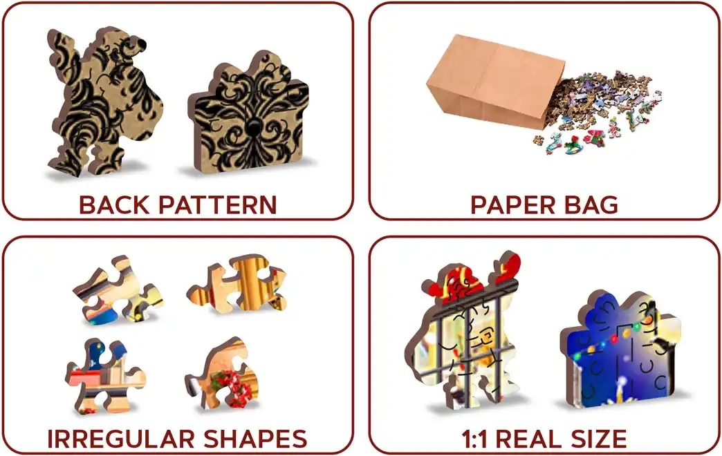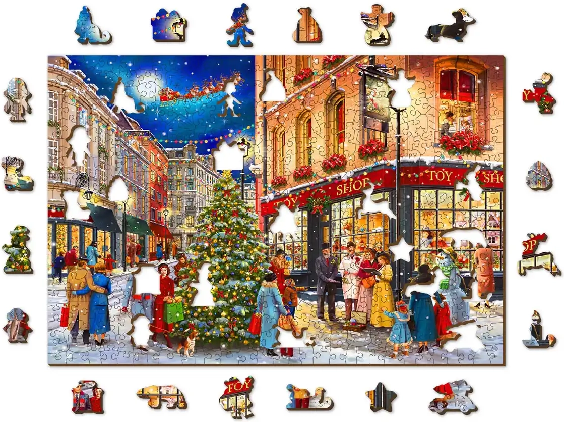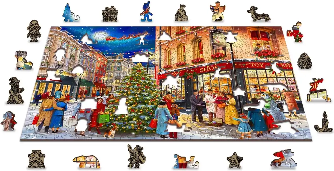 Découvrez la magie de Noël avec ce puzzle en bois premium, idéal pour les amateurs de casse-têtes et comme cadeau élégant. Le motif de rue de Noël avec sapin, choristes et vitrines cosy crée une atmosphère festive agréable et devient une excellente activité pour les soirées d’hiver.