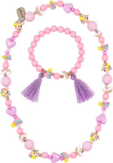 Charmant set de bijoux pour petites coquettes dès 3 ans, comprenant un collier en perles avec motif de licorne et arc‑en‑ciel et un bracelet élastique assorti. La délicate combinaison de rose et de violet clair apporte une touche ludique – idéale pour les fêtes, les séances photo et le quotidien.