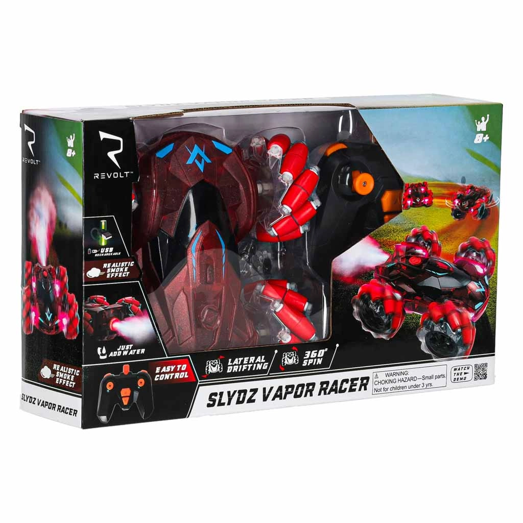 Contenu de la boîte : voiture RC, télécommande, chargeur USB, flacon pour l’eau afin de produire la vapeur et manuel d’utilisation. Produit livré dans une boîte en carton avec fenêtre plastique – parfait comme cadeau.