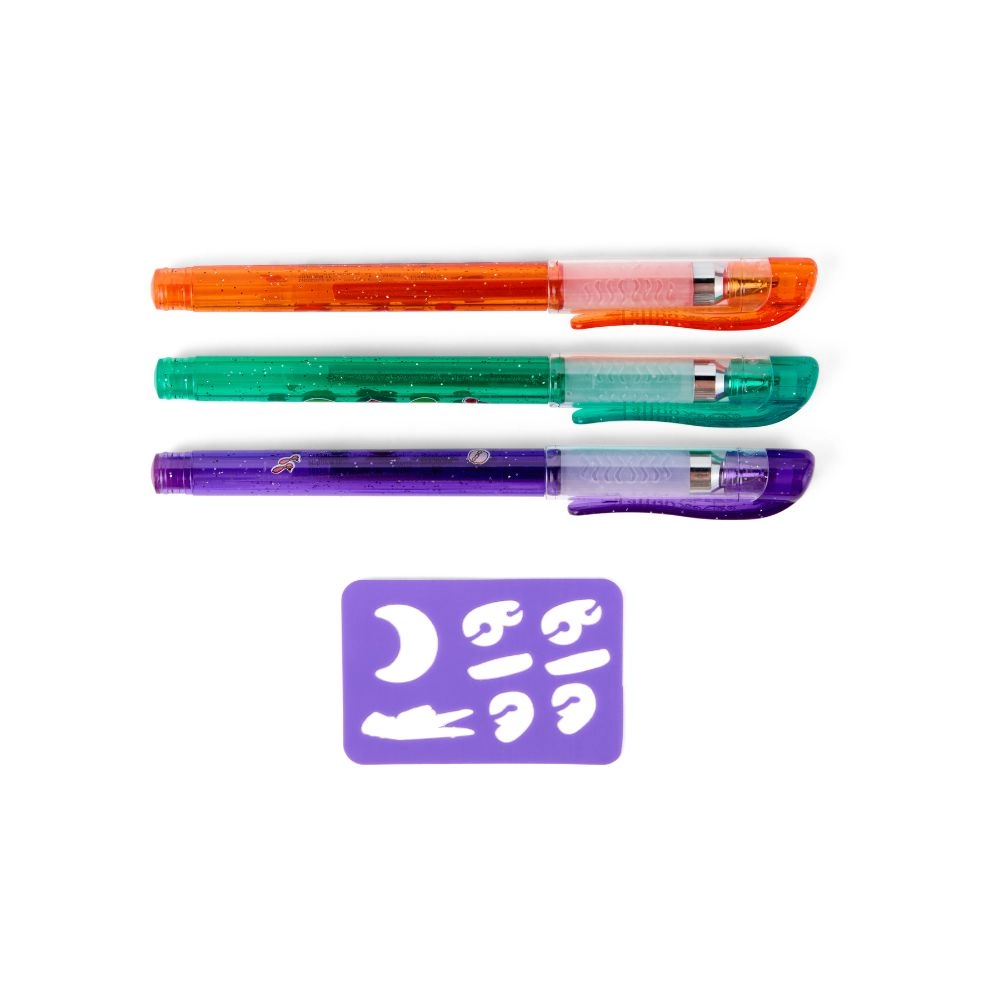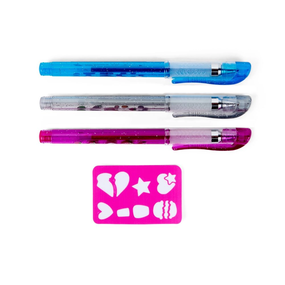Trois stylos gel colorés avec des paillettes donnent un effet WOW à tes motifs. Idéal pour dessiner sur la peau et réaliser des lignes fines avec le pochoir.